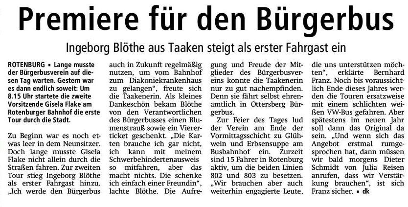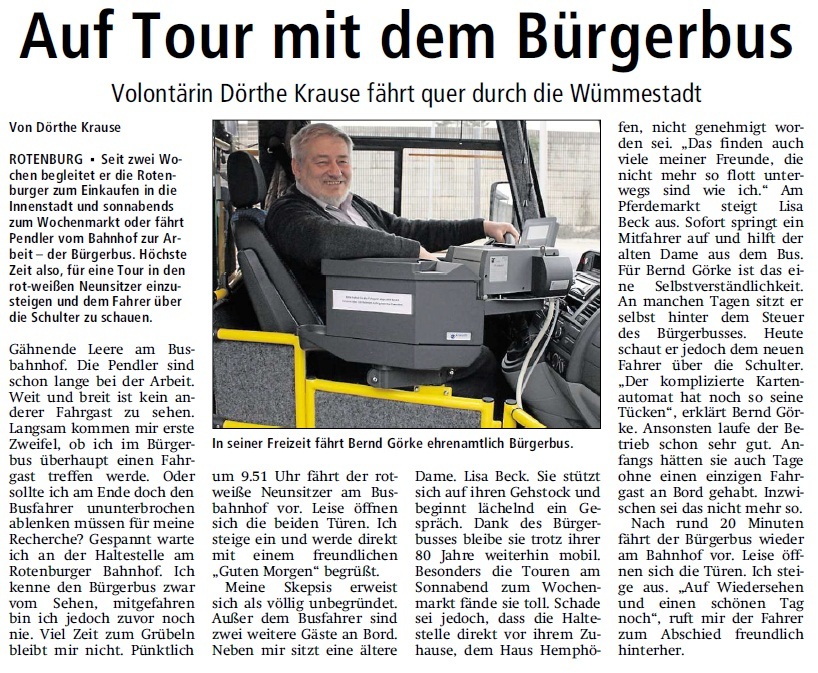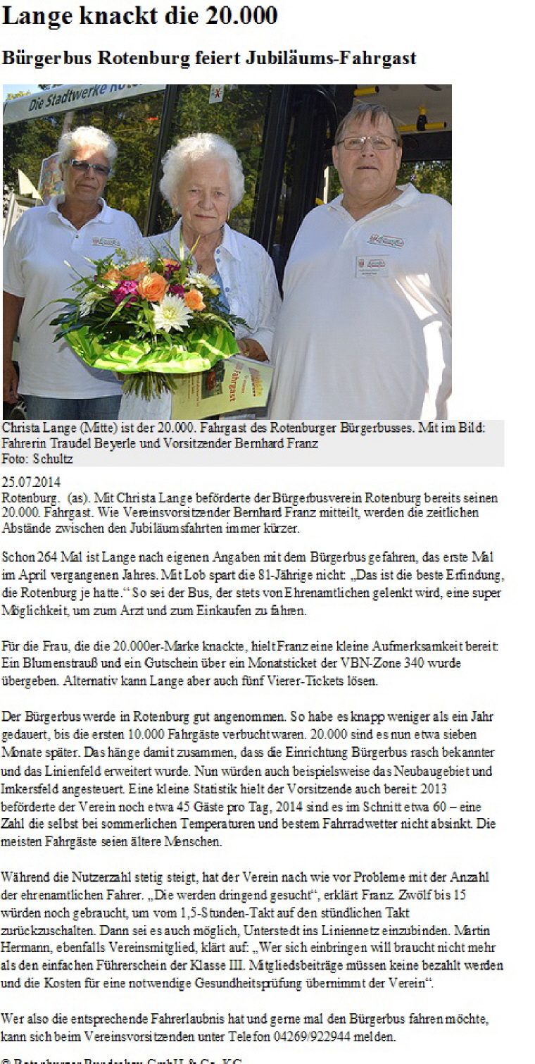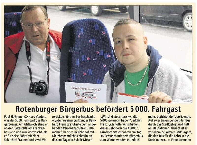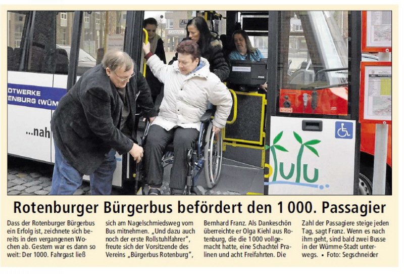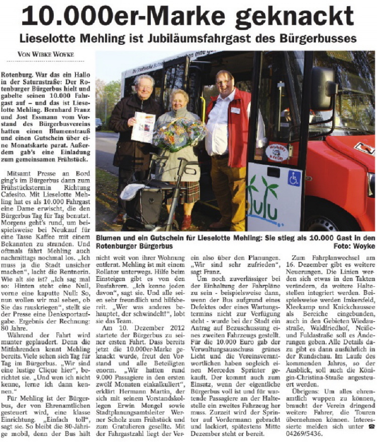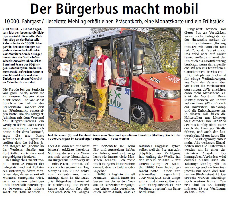 Unser Fahrgast Nr. 33.333 ist Frau Traute Wätje aus Rotenburg. Frau Wätje nutzt den BürgerBus regelmäßig, um zu Ihrer Schwester in den Berliner Ring zu fahren.