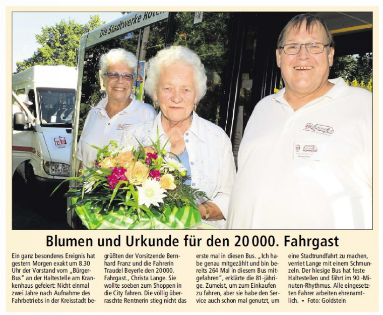 Sie stieg am 15. Juni 2015 um 14:19 Uhr an der Haltestelle Am Wasser in den BürgerBus und wunderte sich, dass ihr anstelle einer Fahrkarte vom Vorsitzenden Bernhard Franz ein großer Blumenstrauß überreicht wurde. Außerdem erhielt sie einen Gutschein für eine Monatskarte bzw. 5 Vierertickets. Die Einladung zum Kaffee konnte sie nicht annehmen, da sie eine Verabredung hatte. Das Kaffetrinken wird in Kürze nachgeholt.